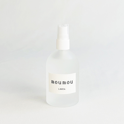 ファブリックを彷彿させる優しい香りが魅力の「moumou」のピローミスト。シンプルなデザインで、ベッドサイドに出しておいても自然にお部屋に馴染みます。